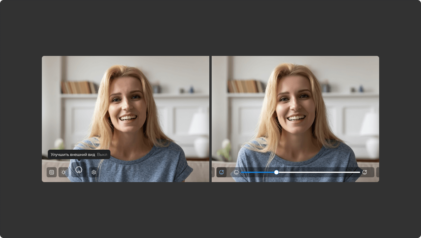 Улучшение внешнего вида — новый ИИ-инструмент в Толке, он сглаживает кожу и выравнивает цвет лица спикера. Работает в режиме реального времени и настраивается с помощью ползунка. Вы сами выбираете, насколько заметным будет эффект.