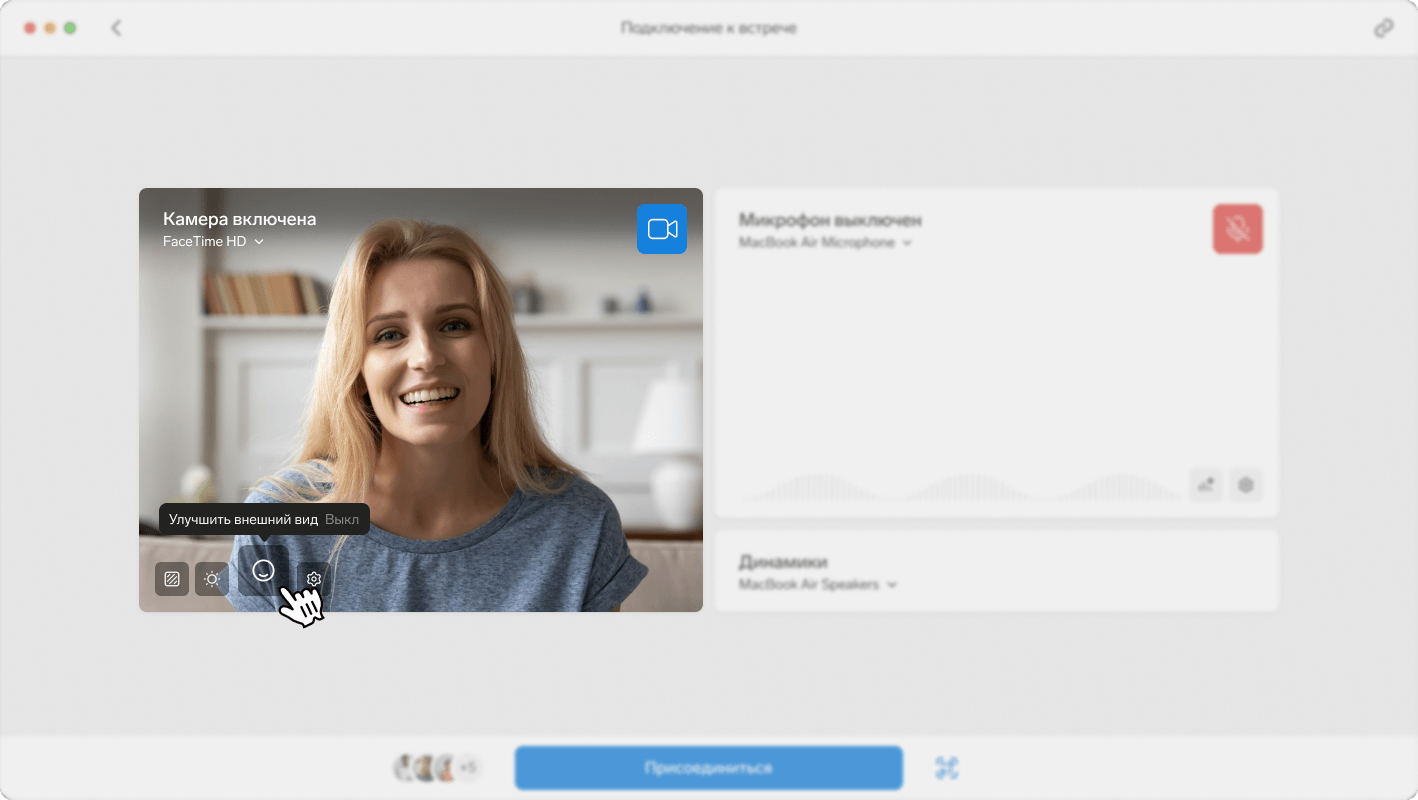 Представьте: нужно срочно подключиться к видеовстрече, а вы в дороге или после бессонной ночи и не успели привести себя в порядок. Толк решает эту проблему — можно включить «Улучшение внешнего вида» и чувствовать себя уверенно в кадре.